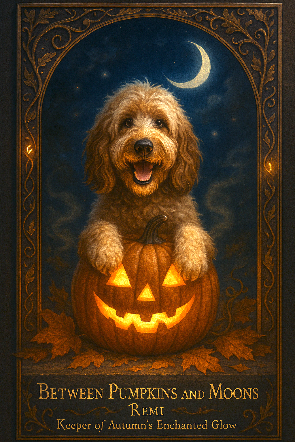 In a pumpkin-lit clearing where whispers of autumn’s mischief stir the fallen leaves, emerges a guardian equal parts charm and enigma. With paws perched upon a jack-o’-lantern throne, this golden wanderer gazes at you as though he alone knows which secrets the crescent moon has tucked away. Fireflies hover like conspirators, their lanterns echoing the grin below. To meet his eyes is to be reminded that October belongs not to shadows, but to playful sovereigns who dance through them.