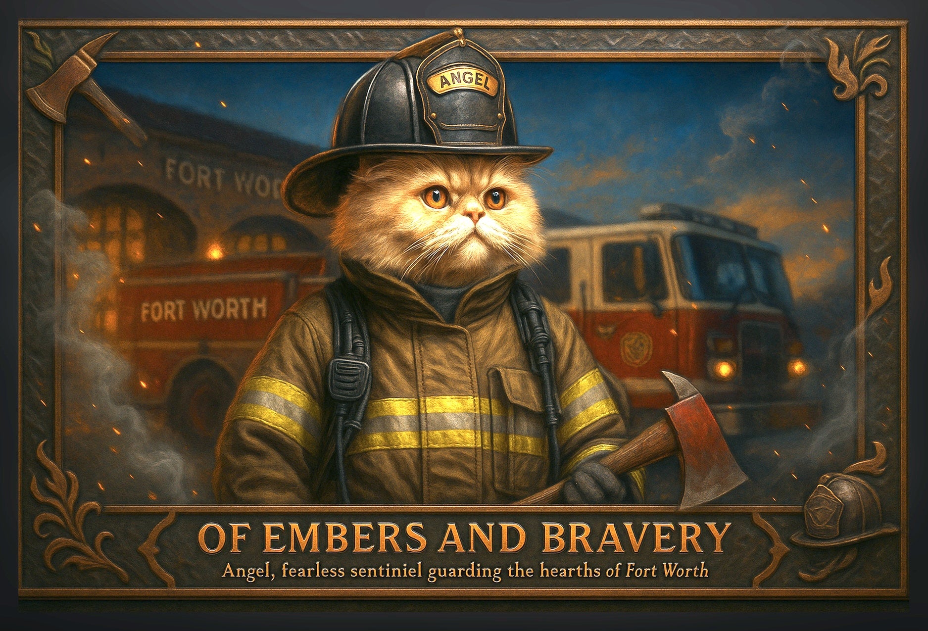 Ash-flecked air glows ember-gold as a steadfast rescuer steps from swirling smoke, helmet crest catching the first hopeful light of dawn. Reflective stripes shimmer across a soot-kissed coat, and calm, watchful eyes scan the scene with practiced resolve. Behind, a coiled hose awaits the next surge of courage; ahead, the promise of lives safeguarded hangs in the hush before action. In this moment, bravery is neither bark nor purr—only a heartbeat steady as drumfire and a spirit forged for service. Hang this portrait where fortitude is honored, and let it remind you that true heroes answer the call on every kind of paw, claw, or wing.