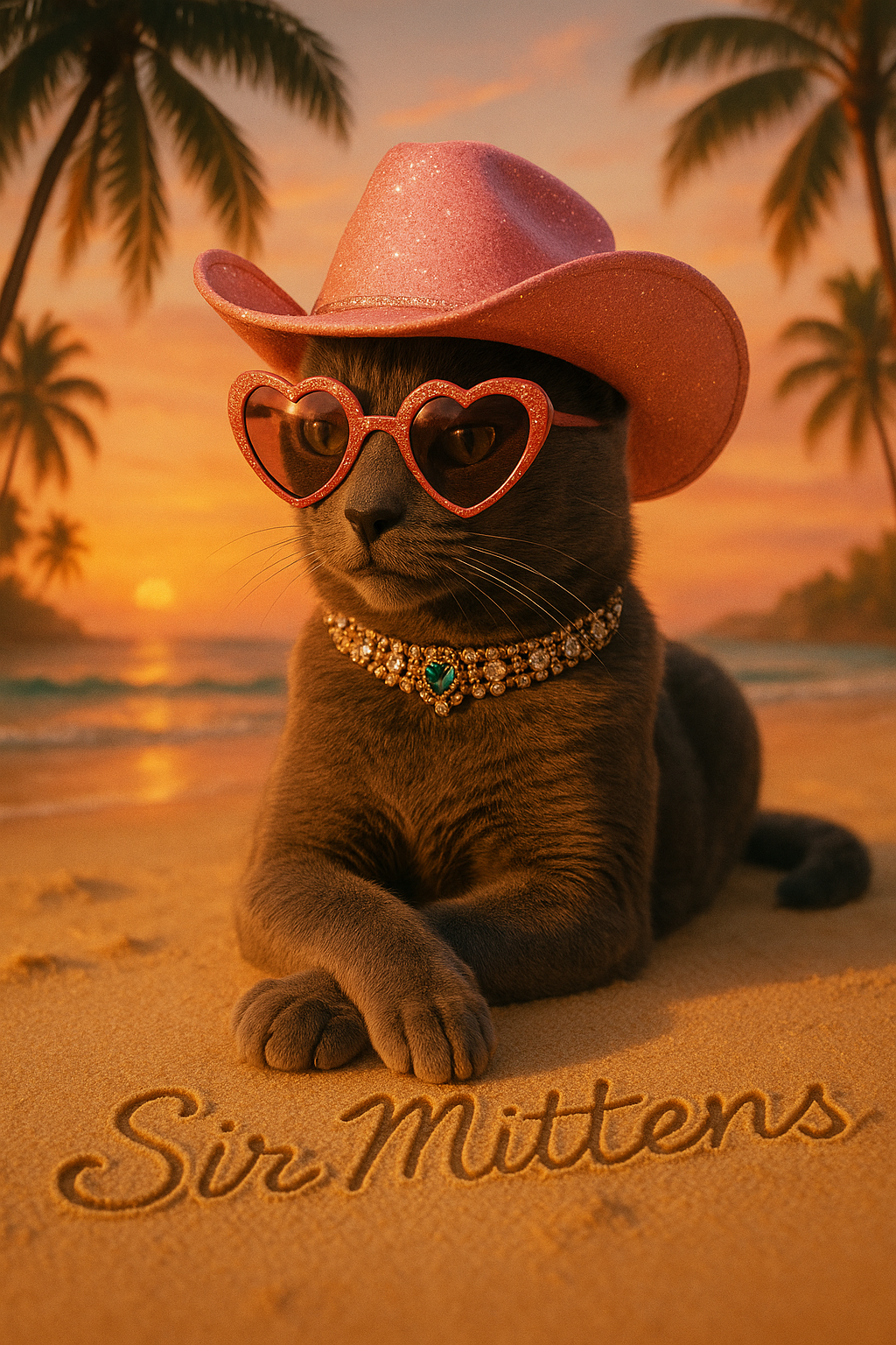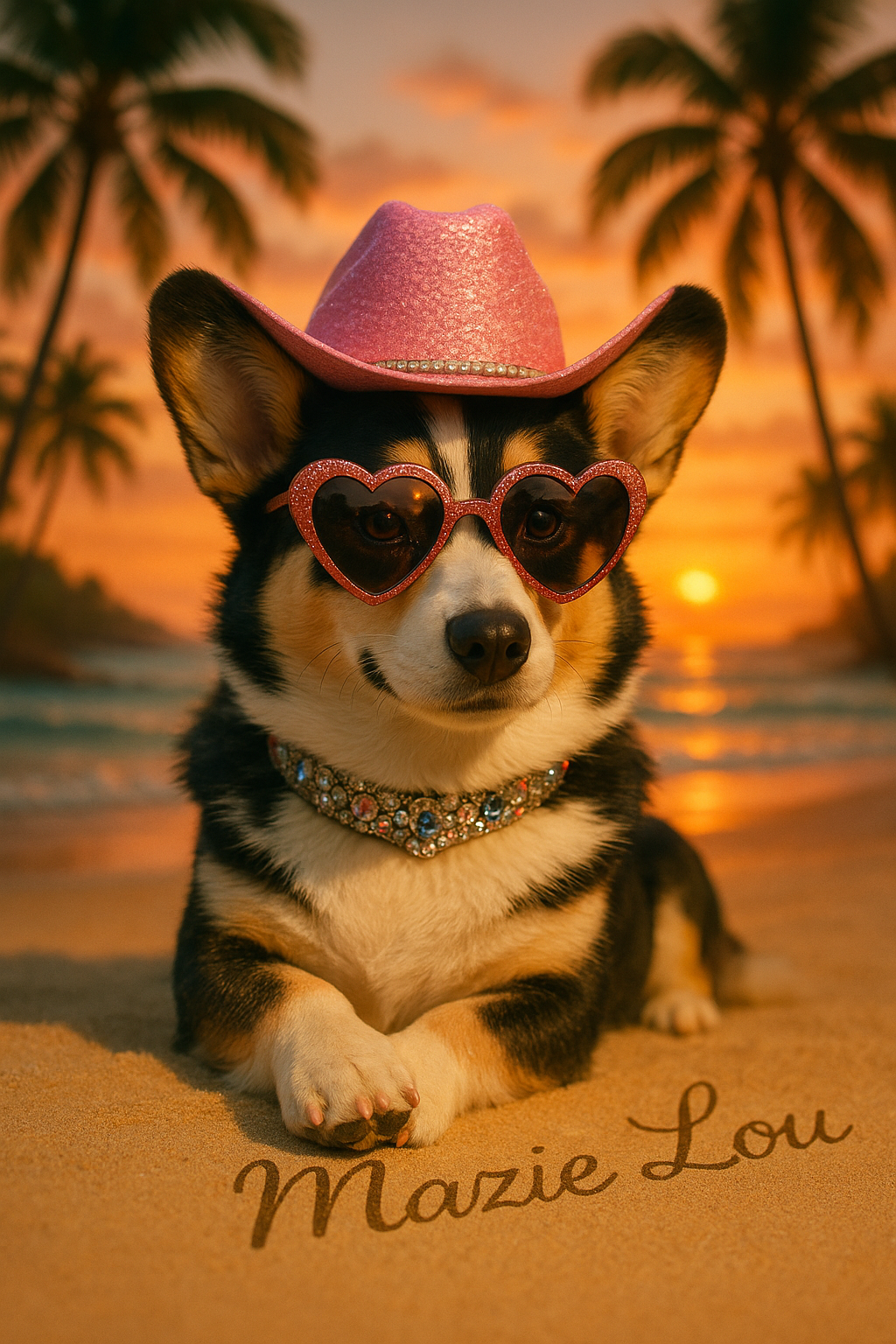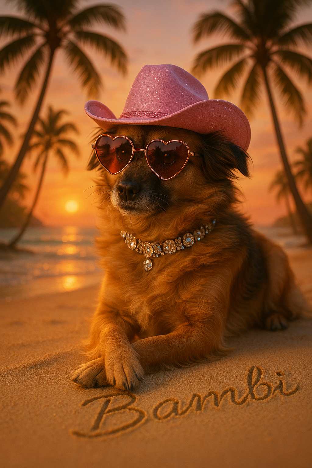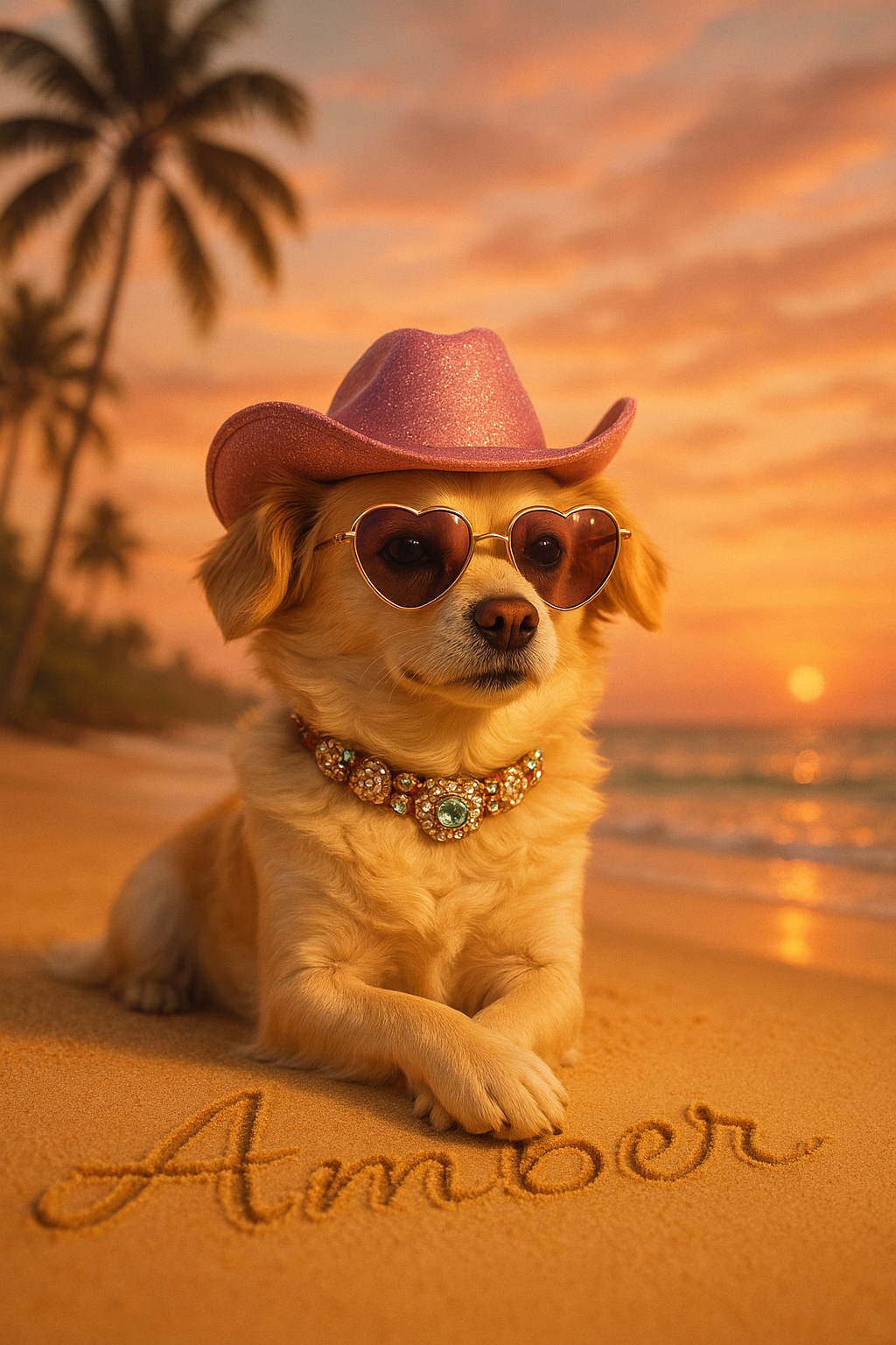 Somewhere beyond the equator, where the air tastes faintly of mango and mischief, Amber reigns over a beachside empire of sun-flecked whispers and sequined secrets. She arrived just after the tide turned—wearing heart-shaped lenses that could melt even the frostiest mojito, and a jewel-studded collar once gifted by a Calabrian countess. They say she once out-sassed an heiress in Capri and taught a tango instructor the true meaning of rhythm. Pink cowgirl hat tipped just so, Amber is less pet, more legend—dripping with a glamour that stirs the soul like a slow, seaside bolero. Display this portrait in your solarium—where the citrus trees lean in to listen—and let it awaken your inner siren of untamed sunsets and stolen glances.