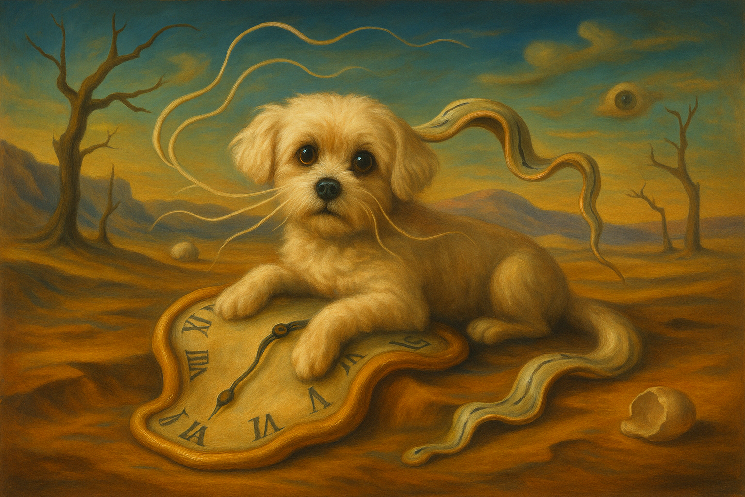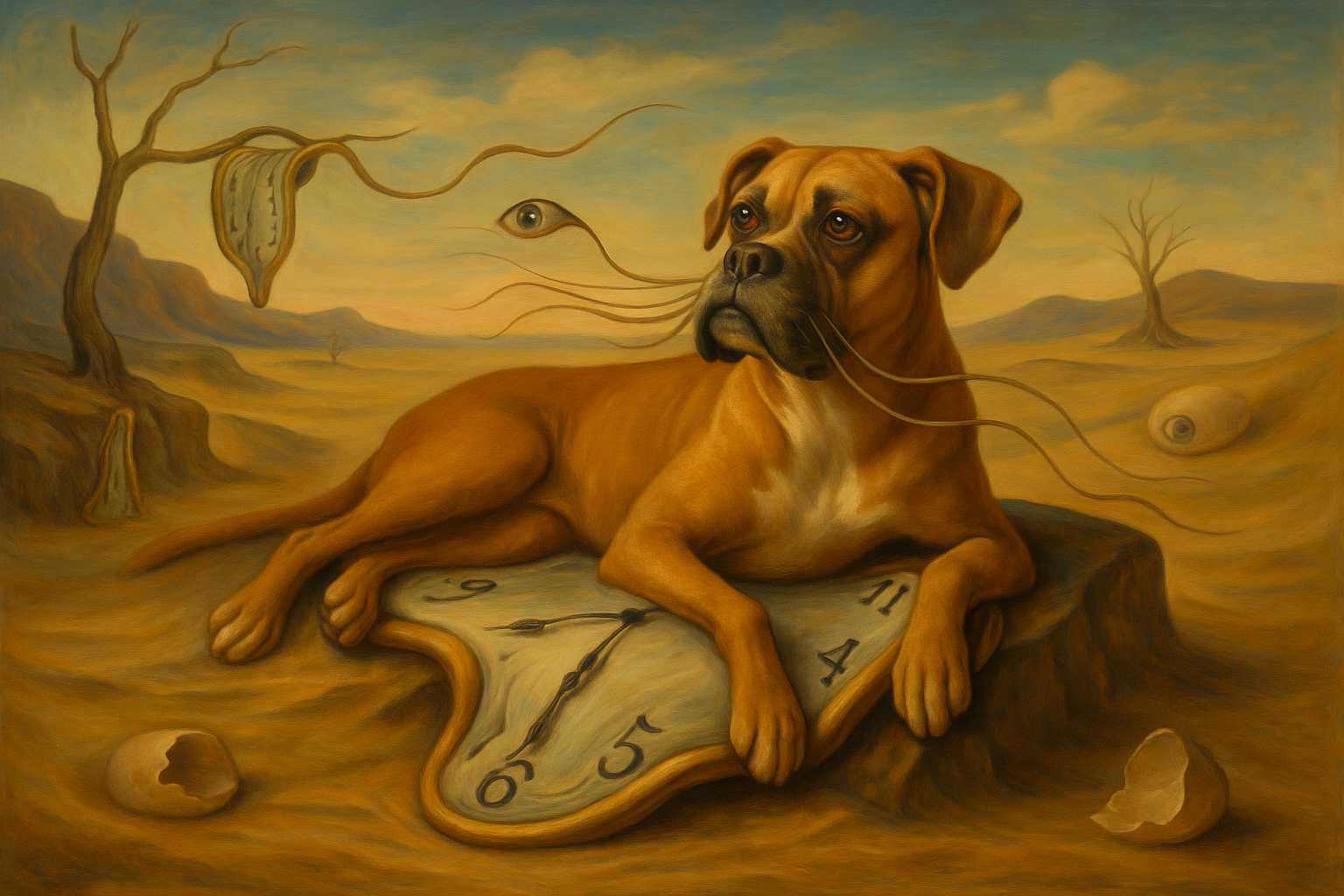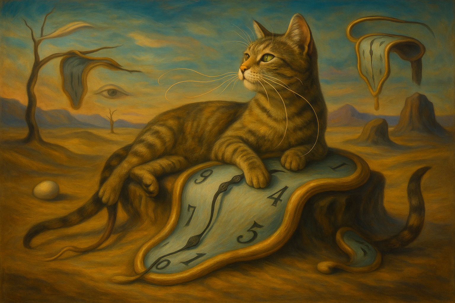 It was on the burnt-orange plains of a dreamscape beyond Salvador's horizon that Aphrodite, the marmalade marvel, first arrested time itself. With a velvet stride and gaze fixed on a horizon that has yet to exist, she lounges atop a clock that no longer ticks, commanding minutes to melt at her leisure. Around her, the desert blooms with impossible relics—eyelid-shaped clouds, trees bearing fabric, whispers of meaning born only in lucid sleep. Hers is a sovereignty of stillness, a canine oracle fluent in riddles and reveries. You don’t simply look at Aphrodite—you fall through her, gently, like a sand-grain in an hourglass without end.