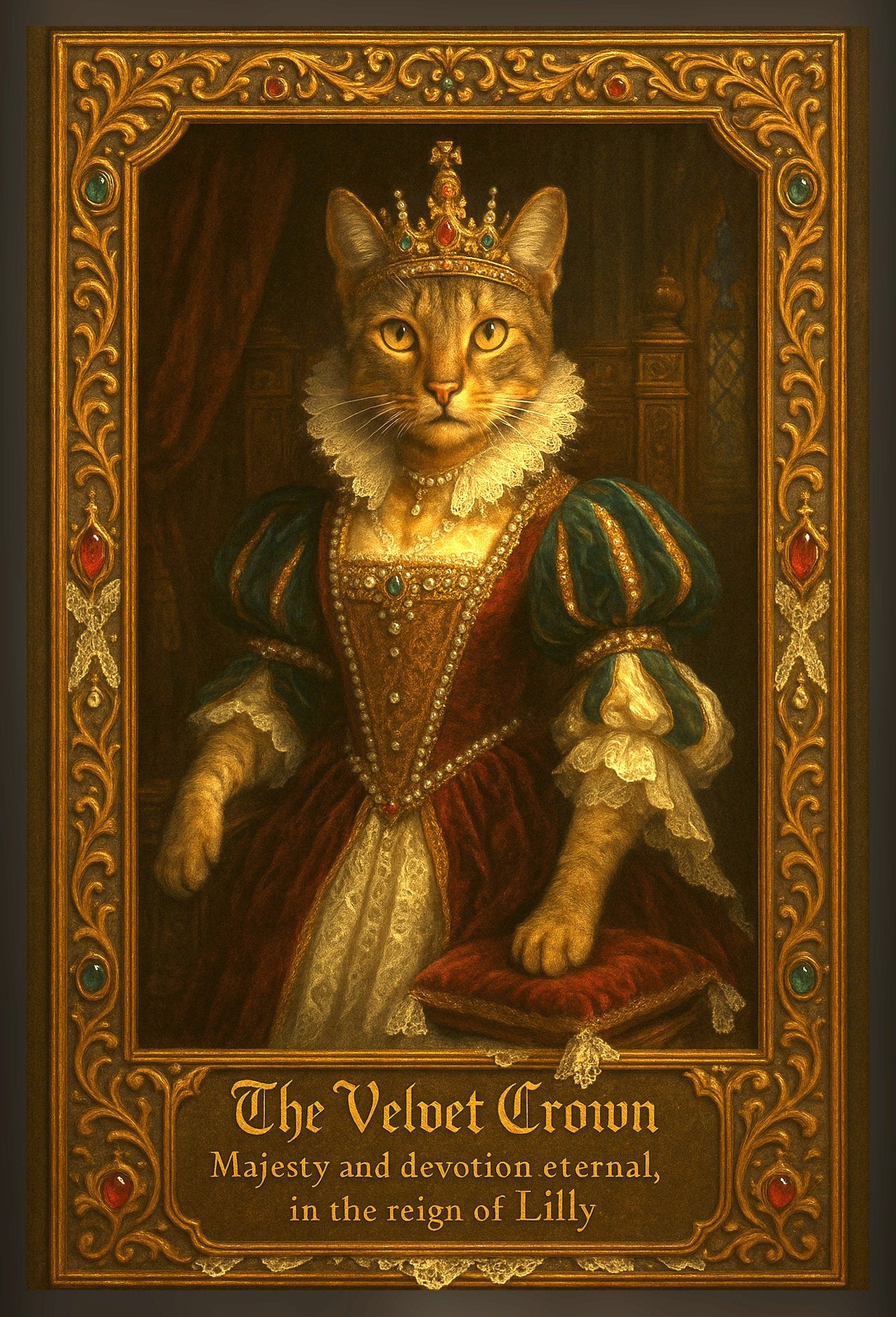 In the velvet‑draped hush of a Victorian hall, a poised sovereign sits upon a carved oaken throne. A diadem of burnished gold crowns & silken locks, while a lace ruffle frames a face both serene and spirited. Emeralds and pearls twinkle across a crimson brocade gown—each gem a tribute from subjects who know that devotion, not duty, binds the realm together. Candles flicker, stained‑glass colors dance across polished floors, and all of court falls silent as the monarch’s steady gaze surveys the scene. In that quiet heartbeat, treaties are forged, hearts are won, and perhaps a secret snack decree is passed. Hang this portrait wherever you wish to summon grace, gentle authority, and the comforting reminder that true power often arrives on soft footsteps and warm regard.