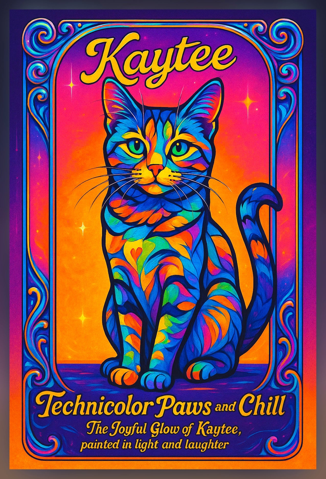 Splash! A wave of electric pigment surges across the canvas, pooling into the relaxed silhouette of a tile‑floor daydreamer. Citrus orange collides with lagoon blue; magenta melts into tangy lime—each hue humming like a synth solo at a rooftop party. Our vibrant muse lounges center‑stage, a grin brimming with pure pop optimism, while swirls of color echo the energy of vinyl beats and neon nights. Hang this portrait where you crave instant joy, and let its technicolor heartbeat remind you that life is a dance floor best enjoyed in fearless, radiant tones.