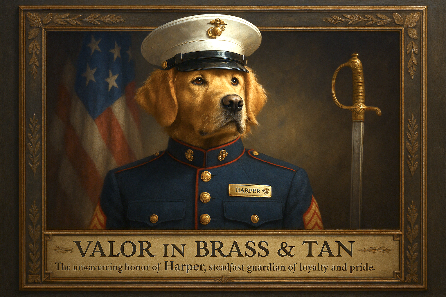 There are guardians, and then there are legends—those who wear discipline like a second skin and loyalty as their eternal insignia. In this portrait, the noble figure gazes beyond victory and defeat alike, seeing instead the quiet dignity of service. His brass buttons gleam with stories untold; his bearing, the stillness before the bugle’s cry. Even the flag behind him seems to stand straighter in his company.