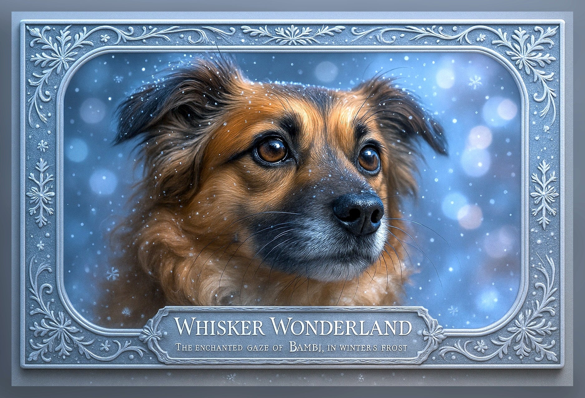 Step softly into the Whisker Wonderland, a luminous realm dusted with winter’s shimmering veil, where every whisker is a delicate antenna tuned to the whispers of snowflakes drifting from celestial heights. Our featured guardian's gaze holds the quiet, mischievous twinkle of one who has danced beneath frost-covered pines and conversed with shadows cast by the moon’s silver glow. With each delicate flurry settling gently on their fur, you sense a deeper enchantment—this is no ordinary snowfall but a ballet choreographed by nature itself. Hang this portrait by your window, where each glance invites you into a timeless reverie of winter’s purest magic.